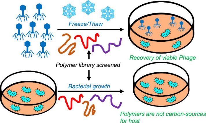 We have a large programme in chemical cryobiology – new chemical tools to help us store and transport biological material, protecting them from cold damage during cryopreservation. Our latest work, in collaboration with Cytiva and Dr Sagona (Warwick) asks the question of ‘what is needed for a polymer to be a good cryoprotectant for bacteriophage’? Phage are emerging antimicrobial agents, and key components of complex microbiome communities, but there has been little research in how to store them. We show in this work, that almost any hydrophilic polymer protects a range of phage during freezing at just 10 mg/mL, which is lower than convention glycerol-mediated freezing. These observations will help us design new protocals and tools to bank viruses. Read the paper here