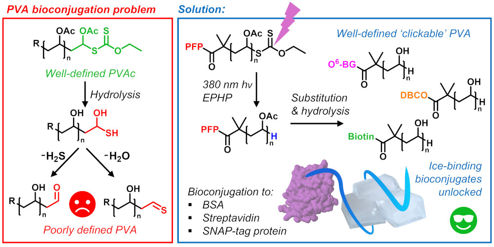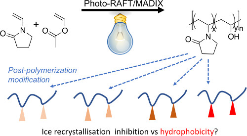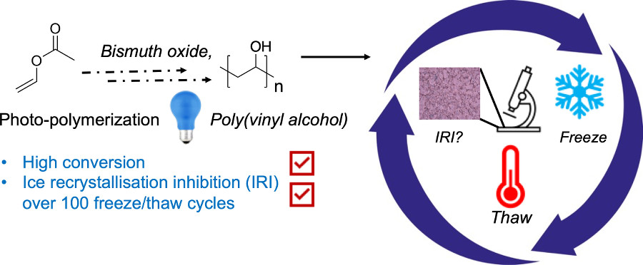 *165 Kontopoulou, I., Congdon,T.R., Bassett, S., Mair, B., Gibson M.I., Polymer Chemistry, 2022, 13, 4692 – 4700, Synthesis of Poly(vinyl alcohol) by Blue Light Bismuth Oxide Photocatalysed RAFT. Evaluation of the Impact of Freeze/Thaw Cycling on Ice Recrystallisation Inhibition link