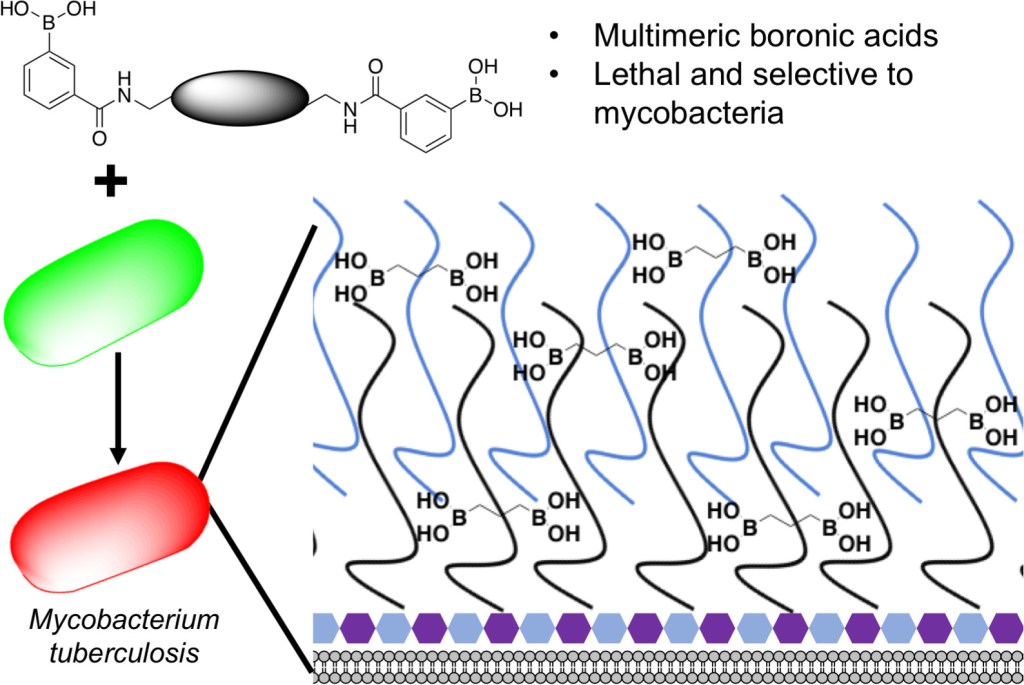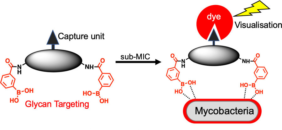 166 Guy, C.S., Tomás, R.M.F., Tang, Q., Gibson, M.I., Fullam, E.C., ChemComm., 2022, 58, 9361-9364, Imaging of antitubercular dimeric boronic acids at the mycobacterial cell surface by click-probe capture, link