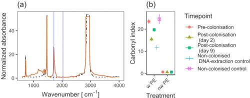 124 Erni-Cassola, G., Wright, R.J, Gibson, M.I., Christie-Oleza, J., Microbial Ecology, 2020,79, 517-526 Early Colonisation of Weathered Polyethylene by Distinct Bacteria in Marine Coastal Seawater, Link