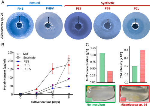 159 Zadjelovic, V., Erni-Cassola, G., Obrador-Viel, T., Lester, D., Eley, E., Gibson, M.I., Dorador, C., Golyshin, P.N., Black, S., Wellington, E.M.H., Christie-Oleza, J.A., Journal of Hazardous Materials., 2022, 436, 129278, A Mechanistic Understanding of Polyethylene Biodegradation by the Marine Bacterium Alcanivorax, Link