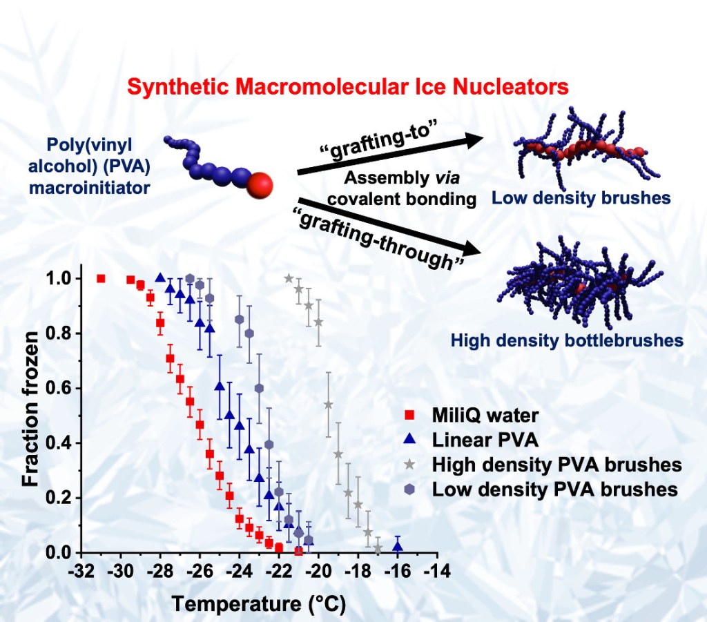 *171 Georgiou, P.G, Kinney, N.L.H., Kontopoulou, I., Baker, A.N., Hindmarsh, S.A., Bissoyi, A., Congdon, T.R., Whale, T.F., Gibson, M.I., Biomacromolecules, 2022, 23, 5285 – 5296, Poly(vinyl alcohol) molecular bottlebrushes nucleate ice. link