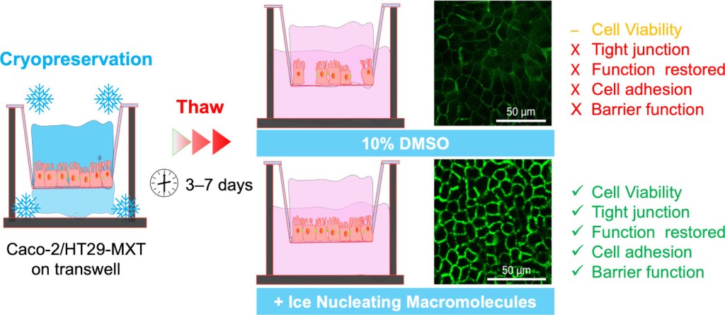 *187. Akalabya, B., Gao, Y., Tomás,RMF., Kinney, NLH., Whale,TF., Guo, Q., Gibson, MI., ACS Applied Materials and Interfaces, 2024, 16, 23027-23037, Cryopreservation and Rapid Recovery of Differentiated Intestinal Epithelial Barrier Cells at Complex Transwell Interfaces is Enabled by Chemically-Induced Ice Nucleation. link